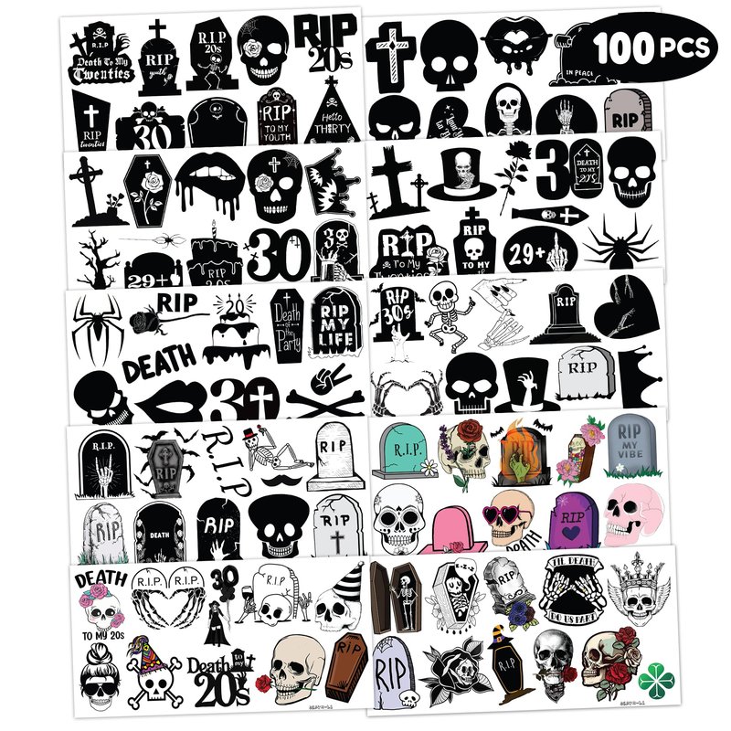 100 PCS 30th Birthday Rip Death To My 20s Temporary Tattoos Sticker Thirtieth My 30th Funeral Black Theme Birthday Party Decorations Supplies Favors Tattoo for Women Men Funny Gifts Prizes Halloween