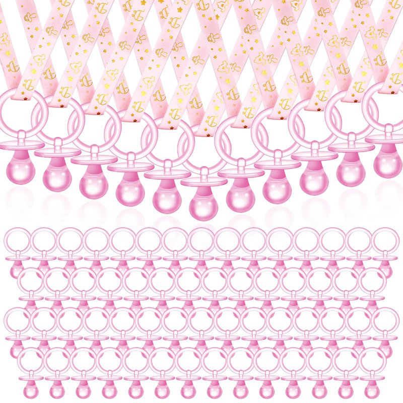 - [ Perfect Baby Shower Pacifiers ] The ribbon was already threaded to the pacifiers. Contains pink 100 pcs baby shower pacifiers, all with cute and beautifully patterned ribbons. It can be hung around the neck or decorate the party. More than enough quantity and perfect workmanship to meet your baby shower party needs.