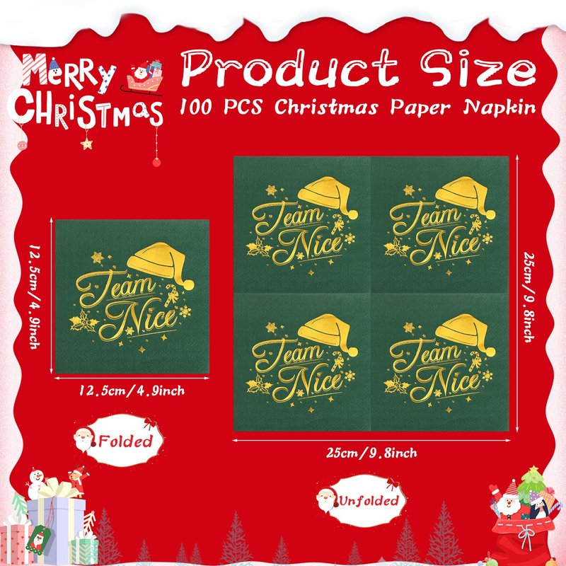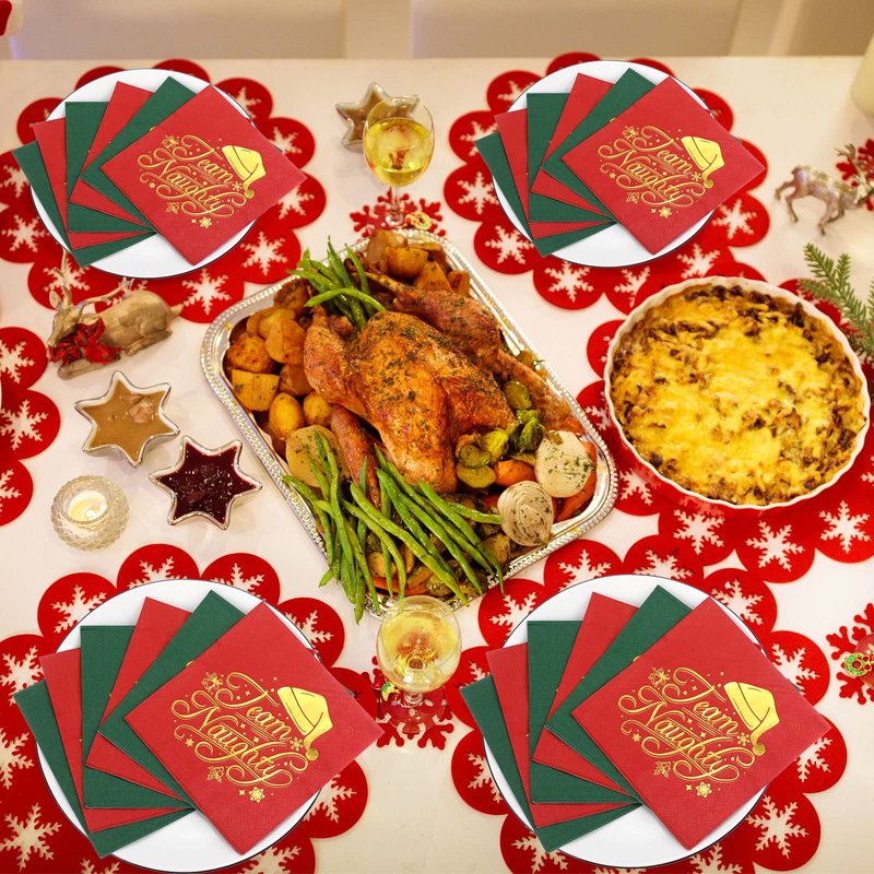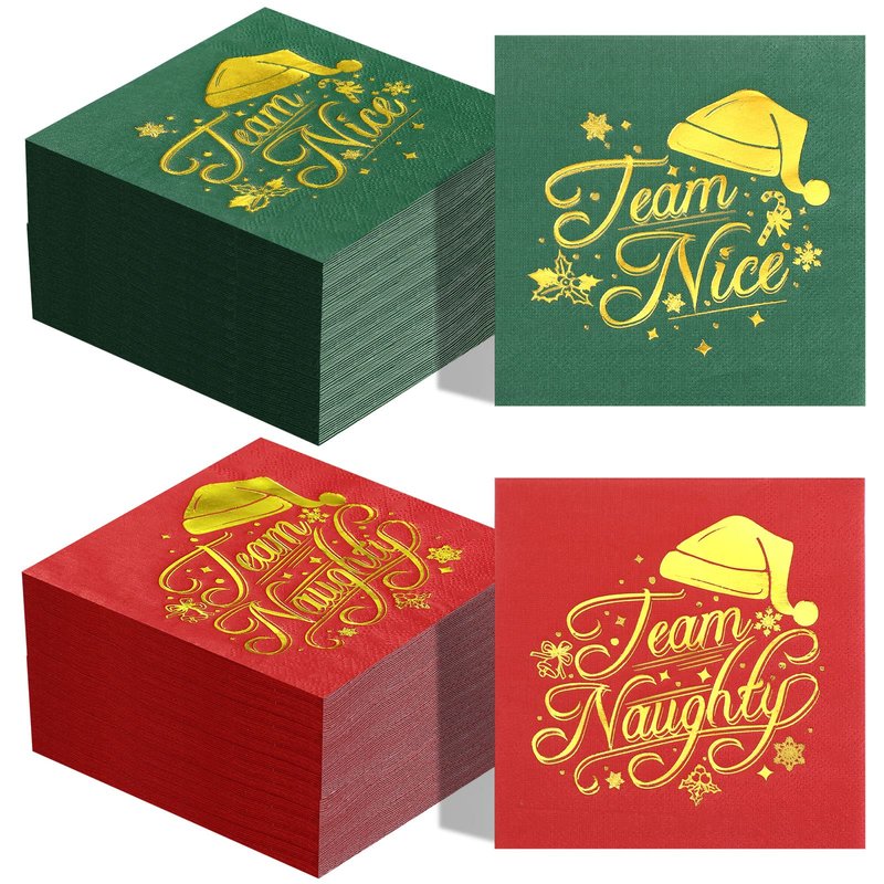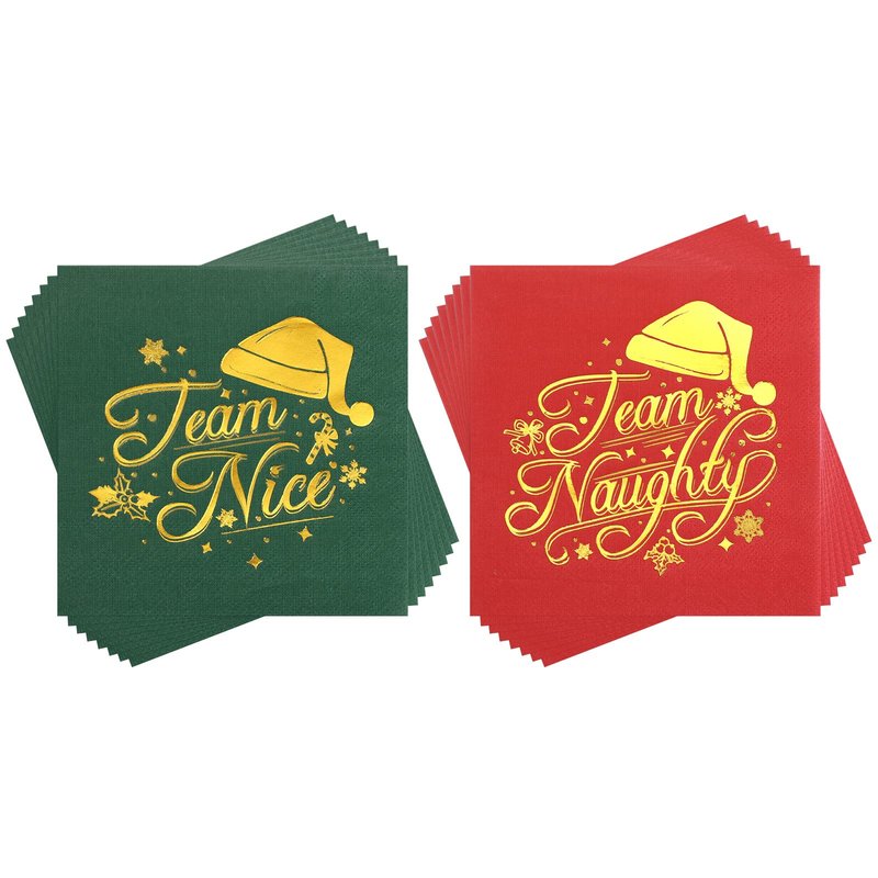 - Exquisite Design: the Christmas cocktail napkins have 2 exquisite design in red and green colors respectively, a quarter of the Xmas napkins are designed with funny foil gold text [Team Naughty] and others, which are surrounded with shiny gold Christmas elements like Santa hat, candy canes, snowflakes, berries, etc., adding elegance and a festive touch that guests will love