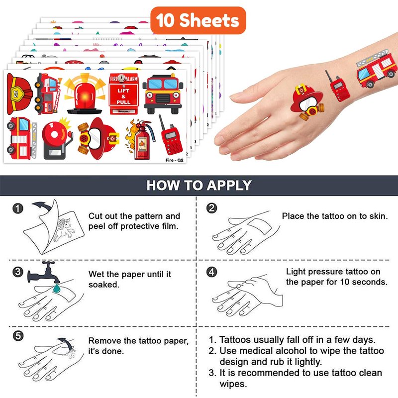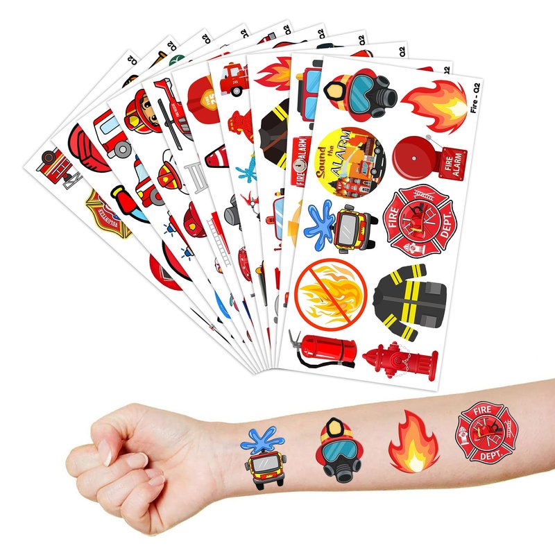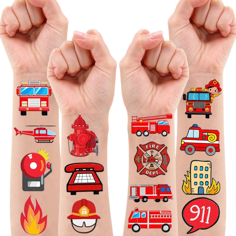 - Cute Firetruck Fire Truck Firefighter Fireman Firehouse Alarm Birthday Party Supplies: 10 sheets Firetruck Fire Truck Firefighter Fireman Firehouse Alarm theme temporary tattoos stickers, features an assortment of cute themed characters, each sheet measures 6.1 x 3.1 inch , all kinds of designs and colors will bring more fun to your party, one size fit all adult and kids.