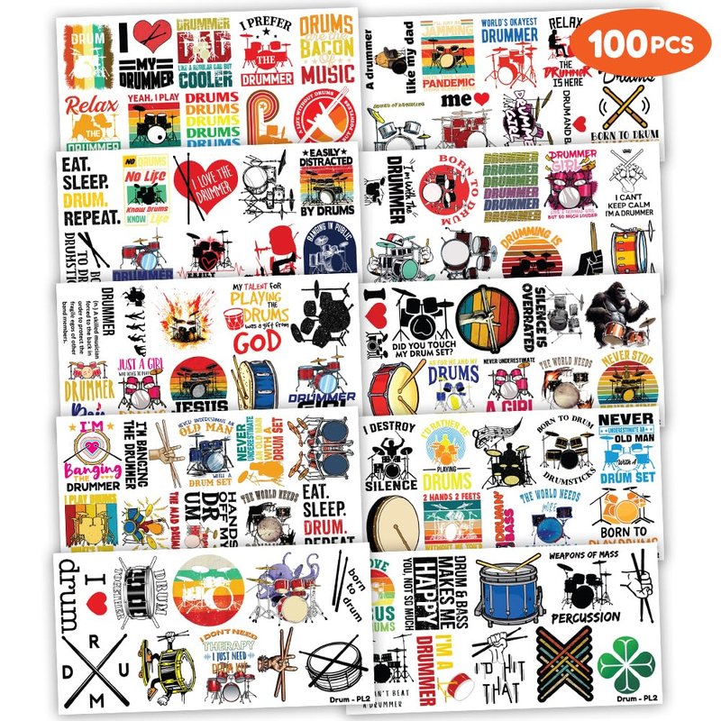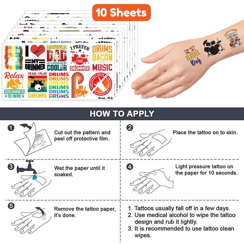 - Pattern rich: Funny Drum Kit Drummer Music Drumming Marching Band Temporary Tattoos for Kids include 10 Sheets 100 PCS, the size of each sheet is 6.1 * 3.1 inches. Easy to share,even if a lot of people's parties, you can have a different tattoo with others.These adorable tattoos will keep you and your little ones – and their friends – occupied for a while. Great for playdates, parties, or rainy days.