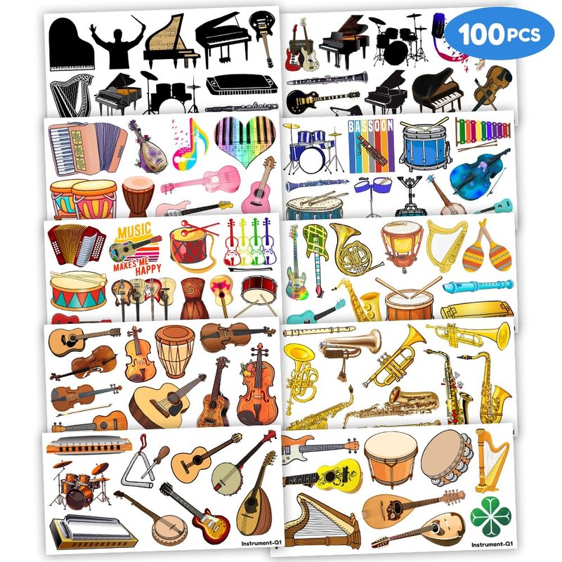 - Cute Funny Musical Instrument Instruments Birthday Party Supplies: 10 sheets Music Guitar Musician Violin Orchestral piano Drum Tuba Trumpet Gramophone Classical theme temporary tattoos stickers, features an assortment of cute themed characters, each sheet measures 6.1 x 3.1 inch , all kinds of designs and colors will bring more fun to your party, one size fit all adult and kids.
