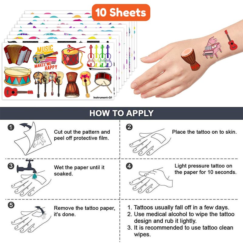 - Perfect Funny Musical Instrument Instruments Birthday Decorations: All the temporary tattoos are design with many themed. Fits any smooth part: face, hands, arms, shoulders, back, legs water bottle, cup,mug and other stuff and so on. Great fun for party favors, birthday gift, clubs, festivals or party supplies,etc. and can be used by children, kids, girls, boys, women, men.