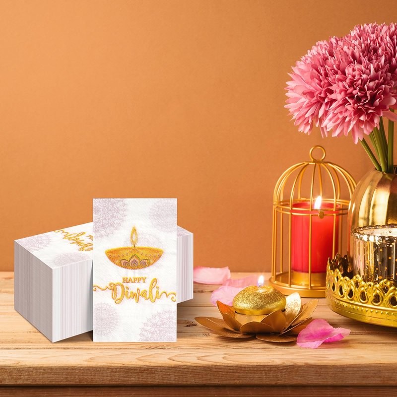 The Diwali paper napkins decorations can be used as decorations for Diwali parties, as well as Indian themed party supplies on dinner tables, in offices, toilets, kitchens, and bathrooms. Their adaptability allows you to add a festive touch to different areas and settings during your Diwali celebrations.