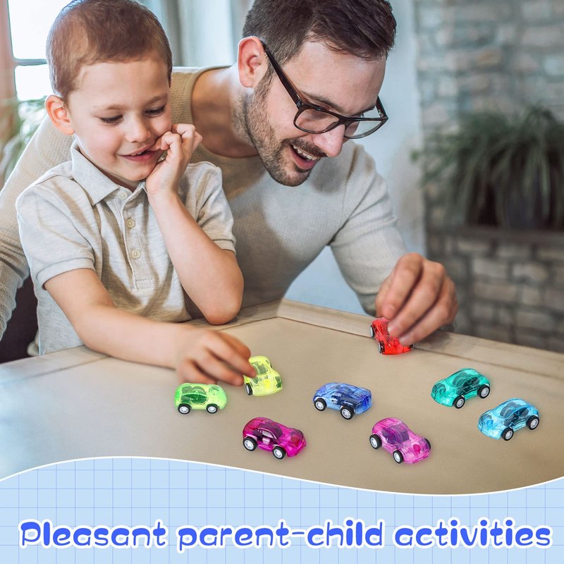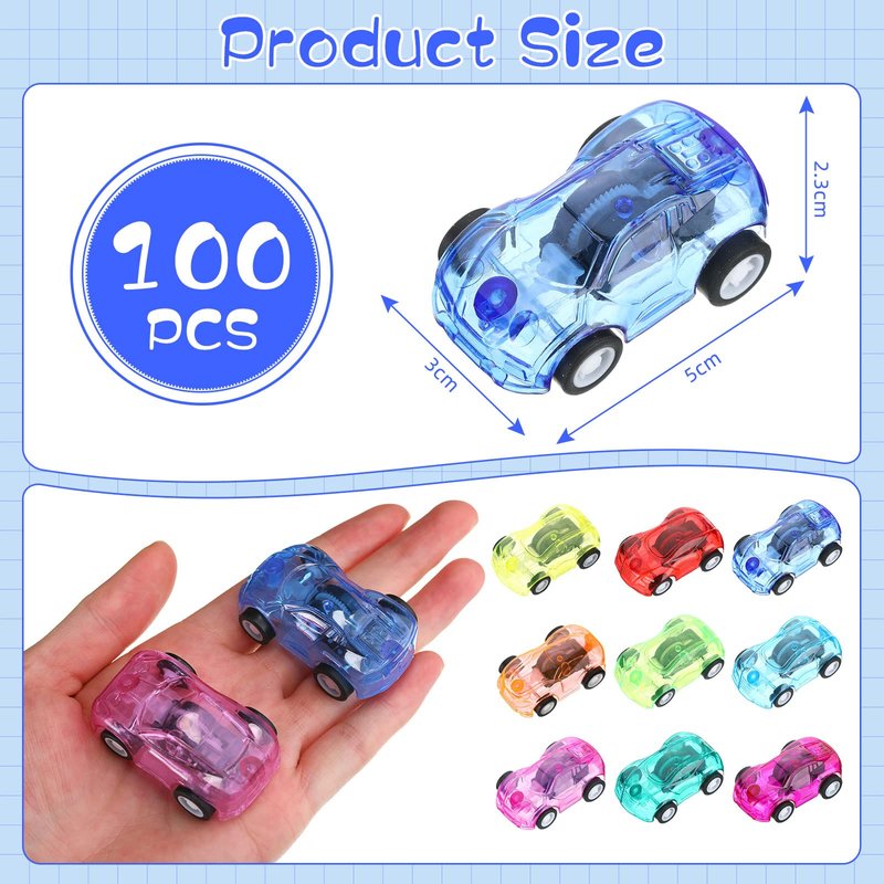 Features:They are also great for parents and family interaction to enhance interpersonal relationships, so you can play these pull back toys with confidence. Your hand brain coordination and logical thinking skills will also be greatly enhanced to strengthen your independence. Simply pull them back, release, and watch how they run. The pull back vehicles are also extremely portable, so boys and girls will always be entertained when you're on the go.Specifications:Material: plasticColor: as shown in the picturesSize: 5 cm/ 1.97 inchesPackage includes:100 x Pull back carsNotes:Manual measurement, please allow slight errors on size.The color may exist a slight difference due to different screen displays.
