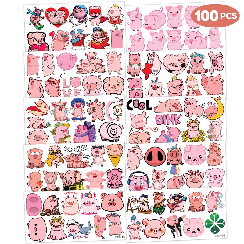 100 PCS Pig Theme Birthday Party Supplies Decorations Favors Decor Pink Pig Farm Animal Temporary Tattoos Stickers for Kids Cute Gifts School Prizes Rewards