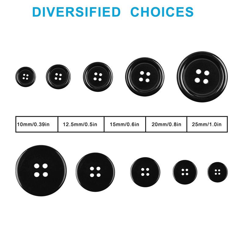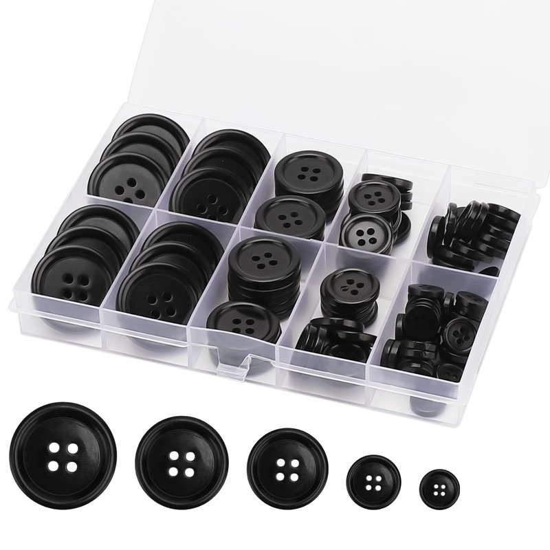 - VALUE FOR MONEY: 100Pcs, four-hole black resin buttons, available in five sizes 0.39inch, 0.5inch, 0.6inch, 0.8inch and 1inch, offering you more choices to meet your different needs. These eco-friendly handmade DIY buttons are packaged in a clear plastic box. Each size is spaced out so you can store and remove them without confusion.