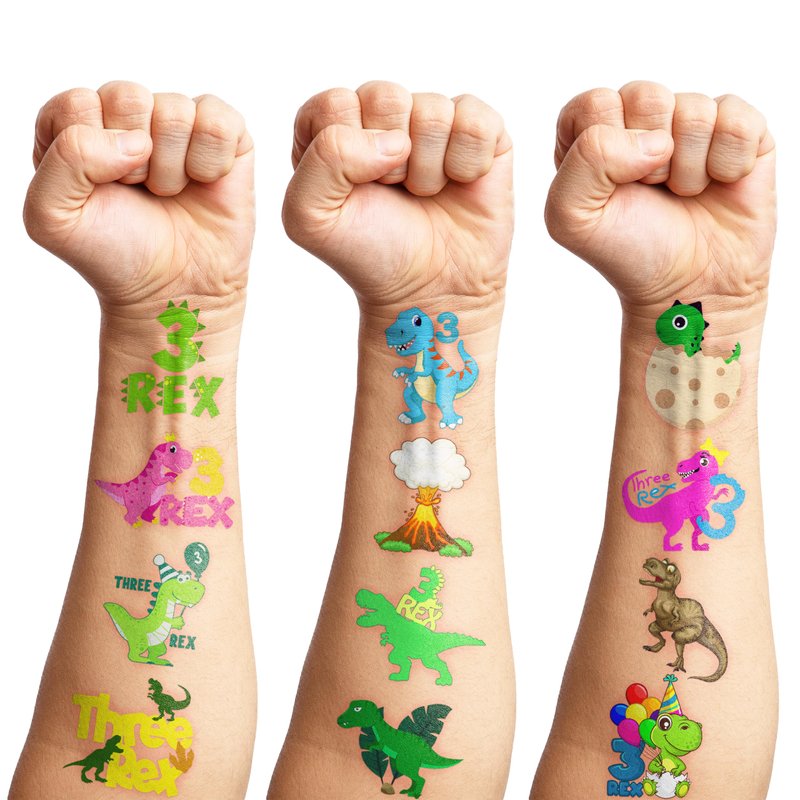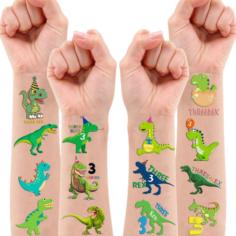 - Widely used: Three Rex 3 Rex Tyrannosaurus T- Rex Dinosaur Temporary Tattoos pieces are suitable for many occasions such as birthday party supplies, party decorations, party favors, party bags, DIY decorations, pool and the beach or gift. Temporary tattoos are the best party favors and goodie bags fillers ever for any kind of celebration!