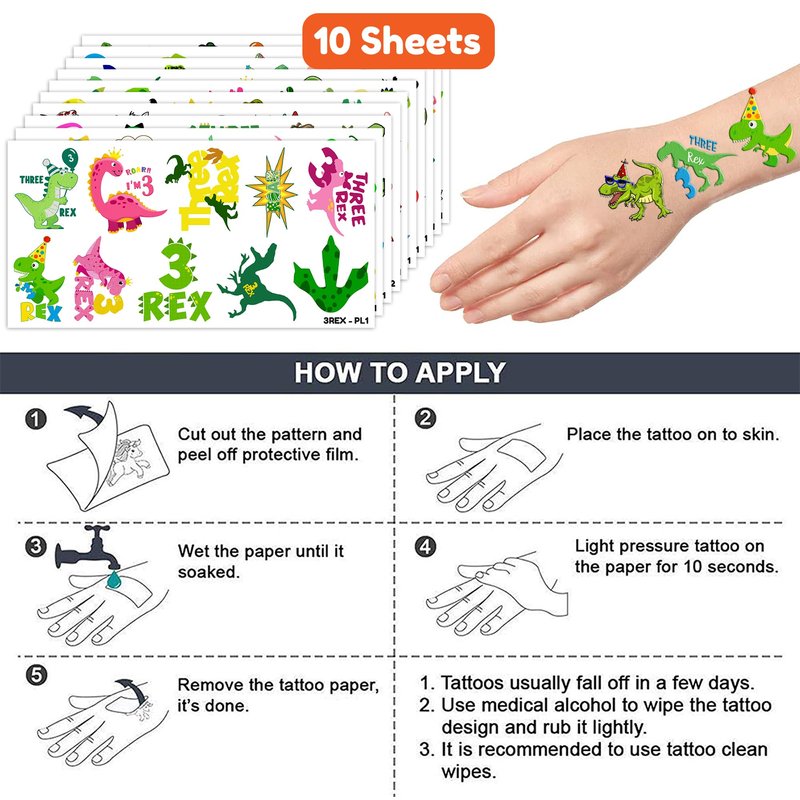 - Pattern rich: Three Rex 3 Rex Tyrannosaurus T- Rex Dinosaur Temporary Tattoos include 10 Sheets 100 PCS, the size of each sheet is 6.1 * 3.1 inches. Easy to share,even if a lot of people's parties, you can have a different tattoo with others.These adorable tattoos will keep you and your little ones – and their friends – occupied for a while. Great for playdates, parties, or rainy days.