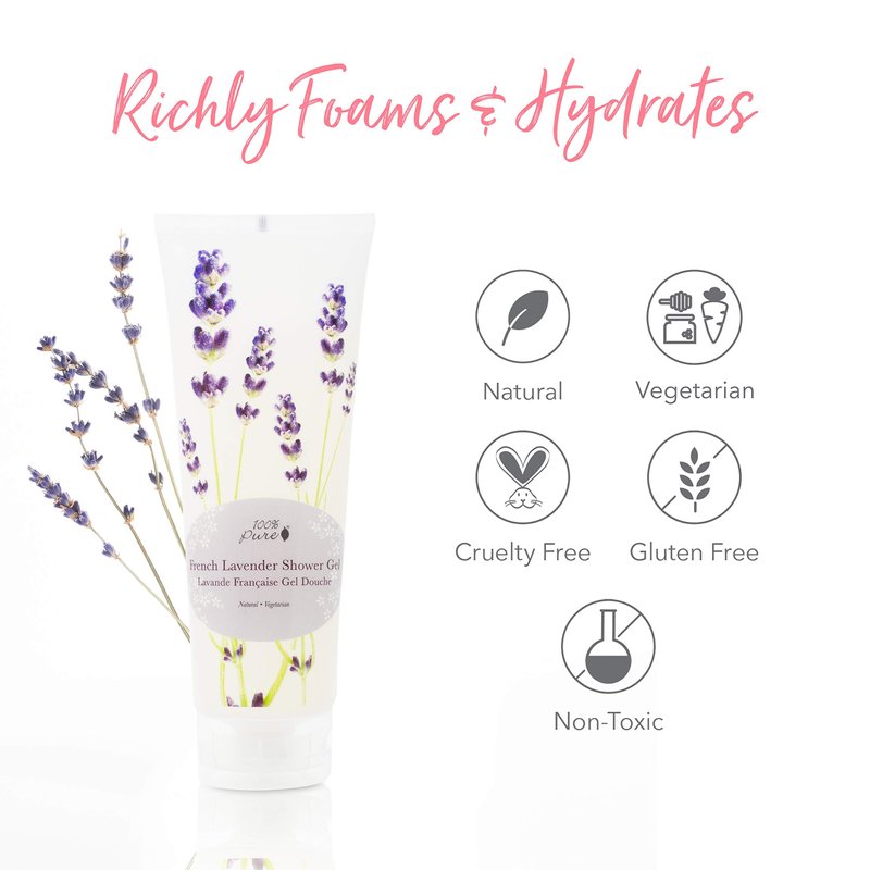 100% PURE French Lavender Shower Gel Natural Foaming & Hydrating Body Wash - Deeply Moisturizing Gentle Soap Cleanser for All Skin Types, Even Sensitive - Gluten-Free - 8 Fl Oz