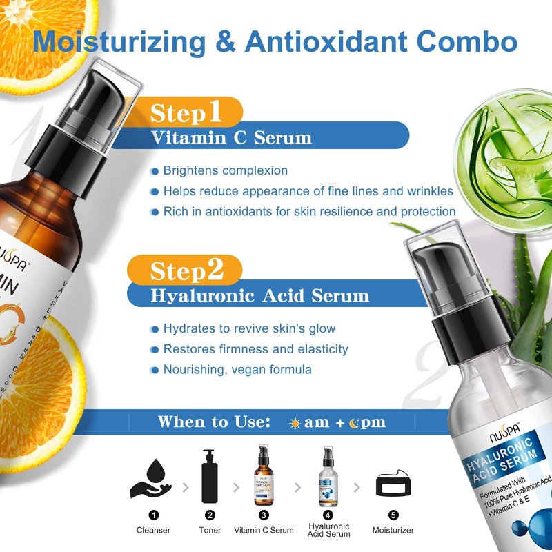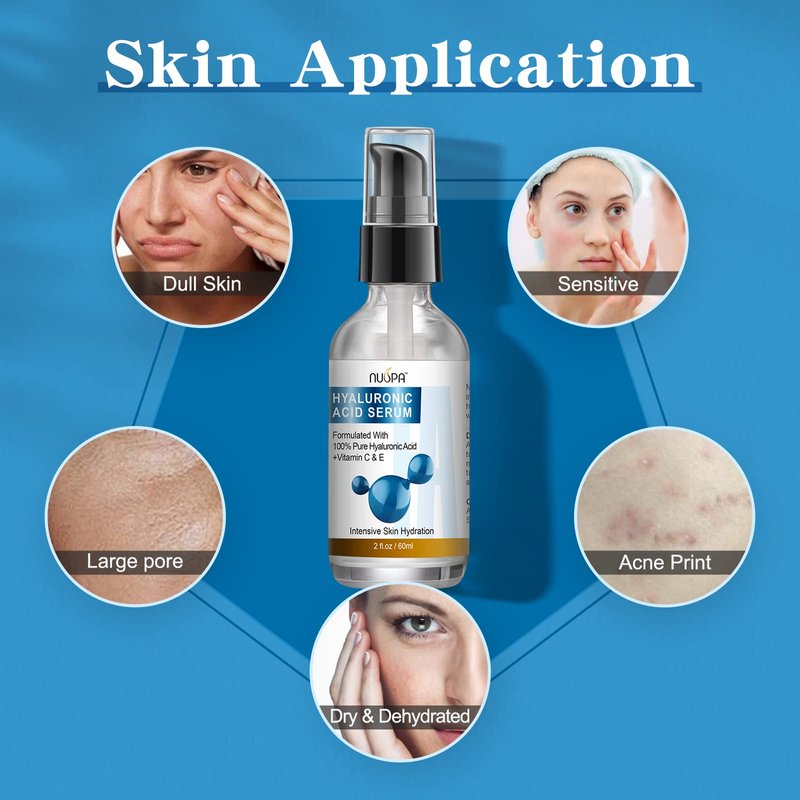 - 【SAFE INGREDIENTS:】 Nuspa Hyaluronic Acid Serum with Vitamin C & E for face and neck; Fragrance free, paraben free, mineral oil free, no synthetic dyes; Dermatologist tested; Suitable for every skin type: dry skin, oily skin, combination skin, sensitive skin and mature skin.