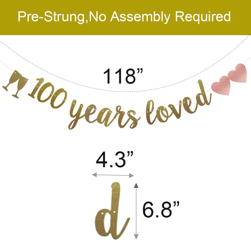 100 Years Loved Banner, Pre-Strung, Gold Glitter Paper Garlands for 100th Birthday/Wedding Anniversary Party Decorations Supplies, No Assembly Required,Gold,SUNbetterland