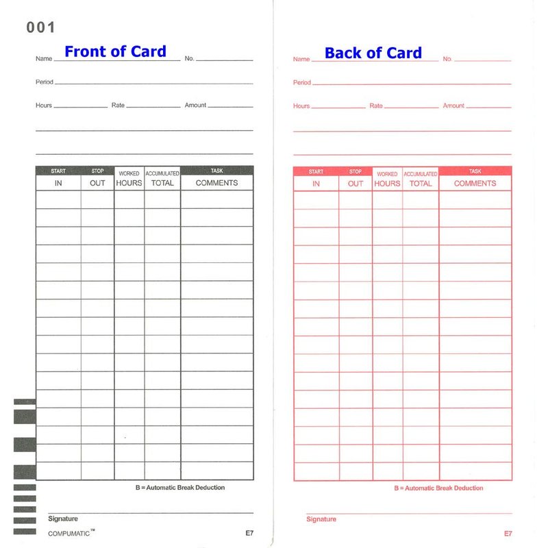 10 packs of 100 E7 time cards, each pack is numbered from 1 to 100, 1000 cards total. Card dimensions 3-3/8" x 7-5/16", will not fit in all time card holders, Compatible with all Lathem 7000E and 7500E time clock models ATTENTION: These time cards are 7-5/16" tall and do not fit in 9" time card racks. They require a smaller pocket 7" card rack sold separately. If you have an existing rack, please confirm the pocket size is less than 7" tall before ordering. If you have a 9" rack, please order the E79-100 version of this card.
