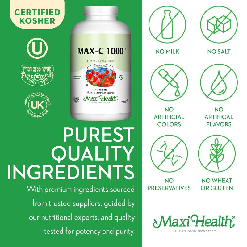- KOSHER CERTIFIED INGREDIENTS - Maxi is dedicated to formulating the best vitamin C 1000mg supplements from pure, natural ingredient sources. Contains no parabens, soy, wheat, salt, gluten, milk, artificial flavors, colorings, or preservatives. Certified Kosher by the OU/UK.