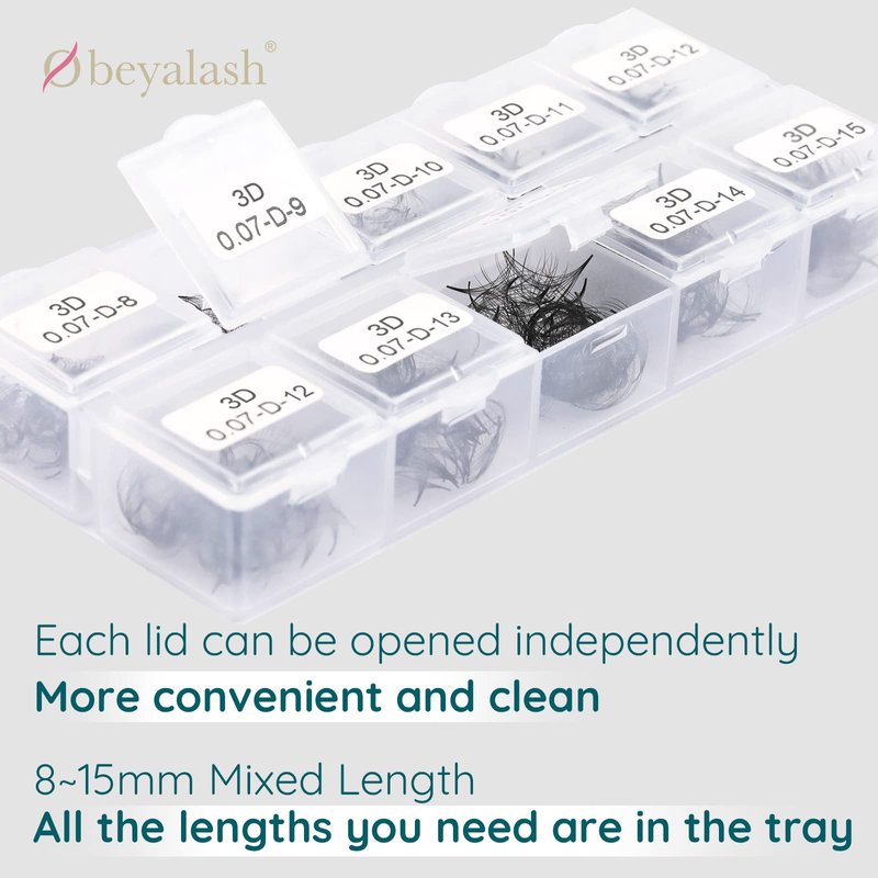 Obeyalash offer promade fans in 3D~11D 0.07mm thickness C/D curl 8mm~17mm length. You can use Obeya Promade fans to create every lash style. Your clients can get great results with different lengths. Obeya Promade lash fans handcrafted by skilled lash artist, lash fans are symmetrical and evenly spaced. Tiny adhesive bases are used for best bonding results, very lightweight. The Loose Fans Lash Extensions offer a much more genuine lasting experience and look. Promade Fans Lashes come in a box of 1,000 fans (only 3.5 cents per fan). 1000 (+1%) loose fans, the amount is correct. 8.3 times the amount of normal 12 rows lash trays. That's enough to serve 6-9 clients. This lash tray offers unbeatable value for the price. 8mm~17mm mixed length in one tray, a lot more cost effective than having to buy each length separately. Loose fans lash extensions are easier to use while working compared to normal tape lash trays. You can quickly pick up and apply eyelash fans with tweezers,the Promade fans are not attached to the tape, the premade fans won’t fall apart, moreover eyelashes are clean without residue.