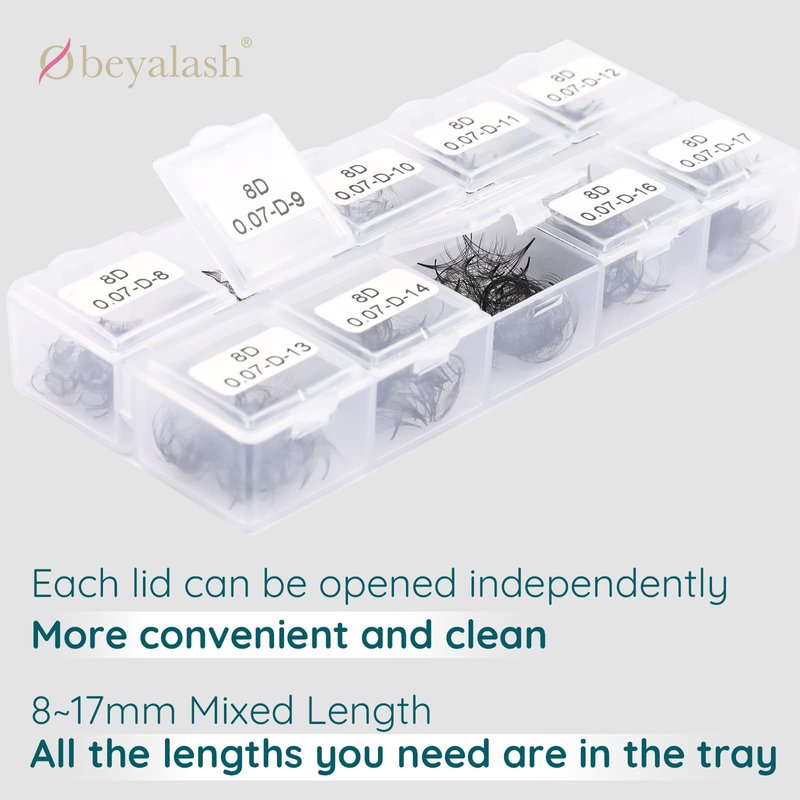 Obeyalash offer promade fans in 3D~11D 0.07mm thickness C/D curl 8mm~15mm length. You can use Obeya Promades eyelash fans to create every lash style. Your clients can get great results with different lengths. Obeya Promade lash fans handcrafted by skilled lash artist, lash fans are symmetrical and evenly spaced. Tiny adhesive bases are used for best bonding results, very lightweight. Loose Fans Lash Extensions offer a much more genuine lasting experience and look. Promade Fans Lashes come in a box of 1,000 fans (only 3.5 cents per fan). 1000 (+1%) loose fans. The amount is correct. 8.3 times the amount of normal 12 rows lashes trays. That's enough to serve 6-9 clients. This lash tray offers unbeatable value for the price. 8mm~15mm mixed length in one tray. Loose fans lash extensions are easier to use while working compared to normal tape lash trays. You can quickly pick up and apply eyelash fans with tweezers, the Promade fans are not attached to the tape, premade fans won’t fall apart, moreover eyelashes are clean without residue.
