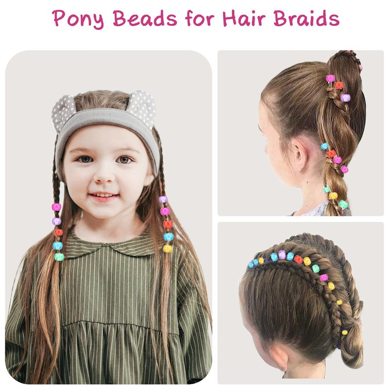 - 【Great Value Set】Our beads for hair braids includes 500pcs 6x9mm glitter pony beads (inner hole size is 4mm), 500pcs elastic rubber bands, 5pcs quick beaders, 1 rattail comb and 2pcs duckbill clips. The quantity is abundant and the styles are diverse, very suitable for kids hair braiding.