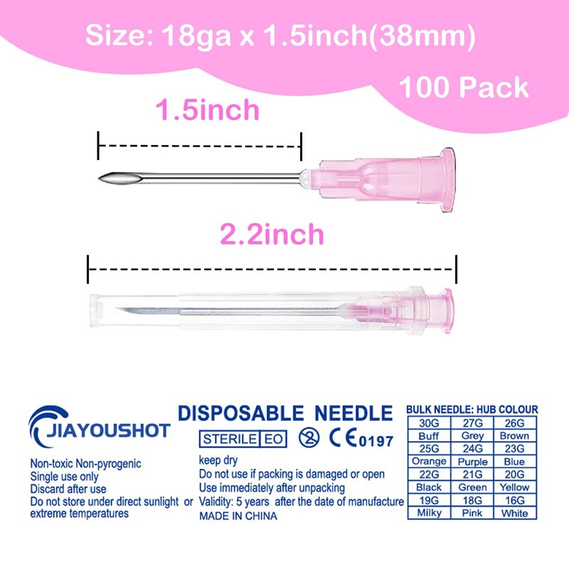- Packaging Specifications: This product is packaged in a carton, containing 100 individually packaged 18Ga,1.5inch/38mm needles, each needle has its own cap.