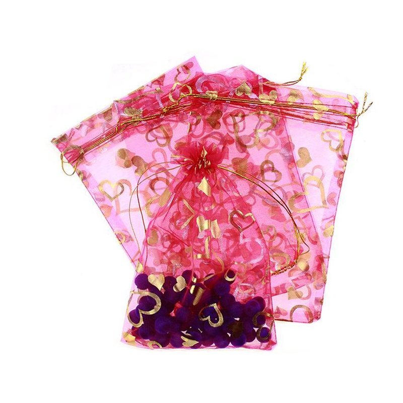 100PCS 5'' x 7''/13cm x 18cm Heart Printed Organza Drawstring Bags Gift Packing Pouches Sample Display Tulle Pockets Wrapper Bathroom Organizer for Candy Jewelry (Rose Red)