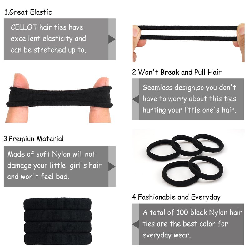 - 【Classic Black】The classic black color can be easily matched with different hair colors,as well as all your outfits and hairstyles.100 Pieces Black Nylon Hair Tie can be used for a long time,very practical.Great ponytail holders for daily use and workouts.