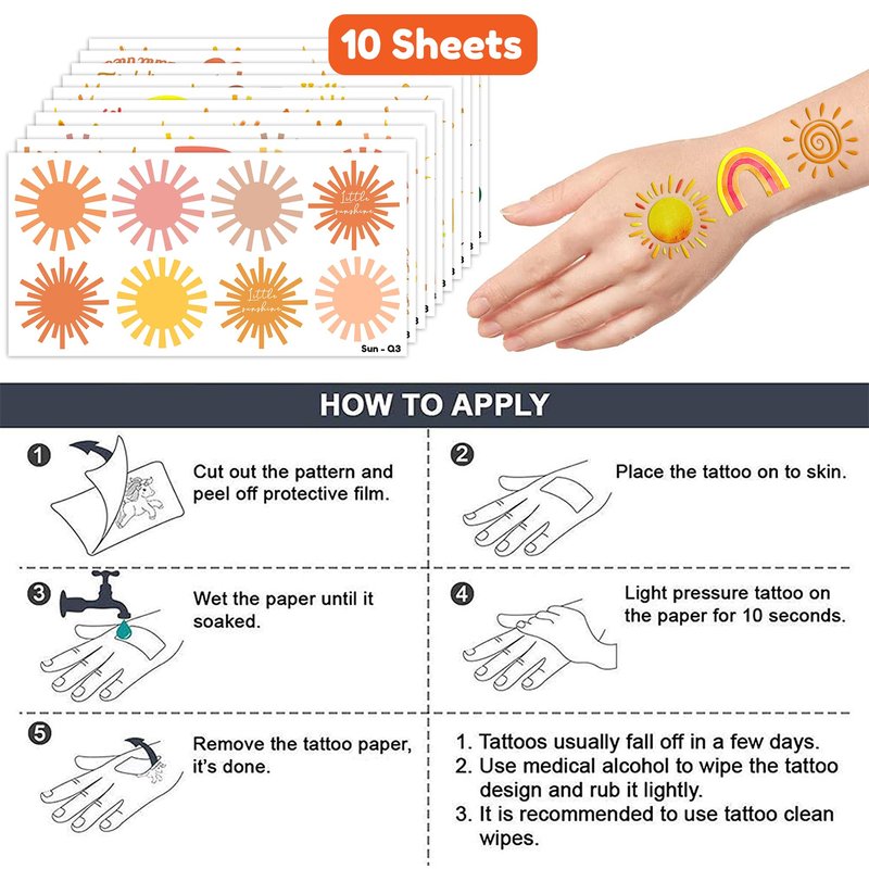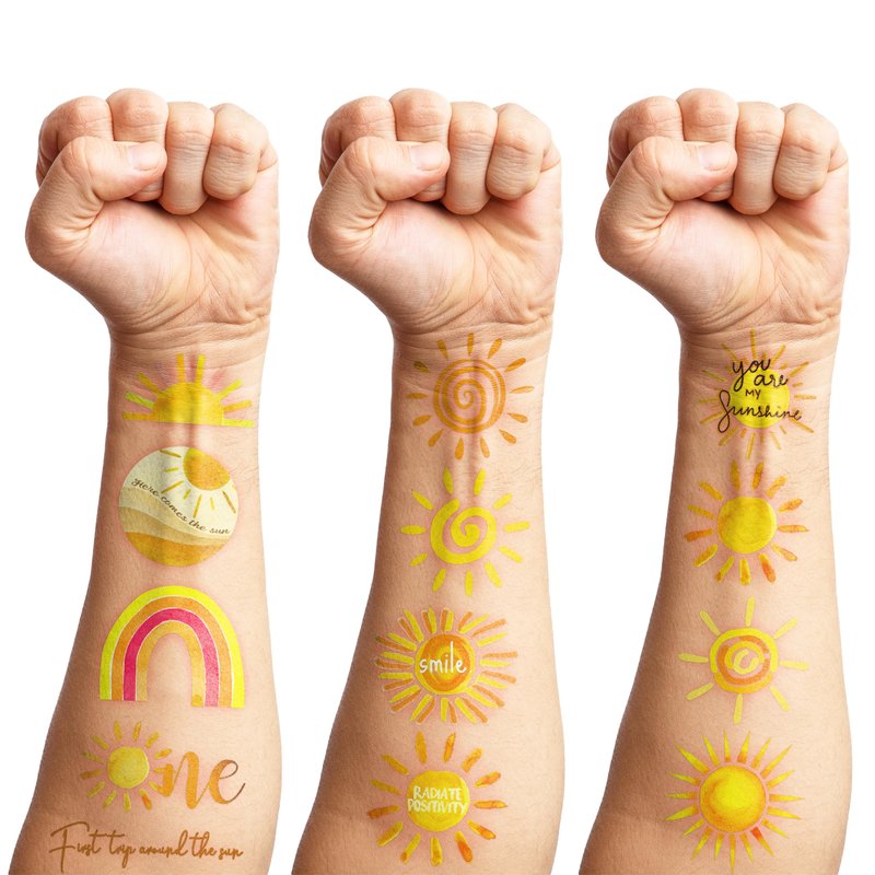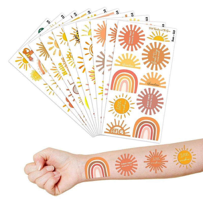 - Cute Boho First Trip Around The Sun Birthday Party Supplies: 8 sheets Hello Sunshine Sunset theme temporary tattoos stickers, features an assortment of cute themed characters, each sheet measures 6.1 x 3.1 inch , all kinds of designs and colors will bring more fun to your party, one size fit all adult and kids.