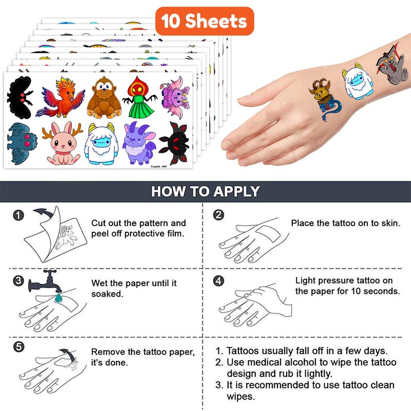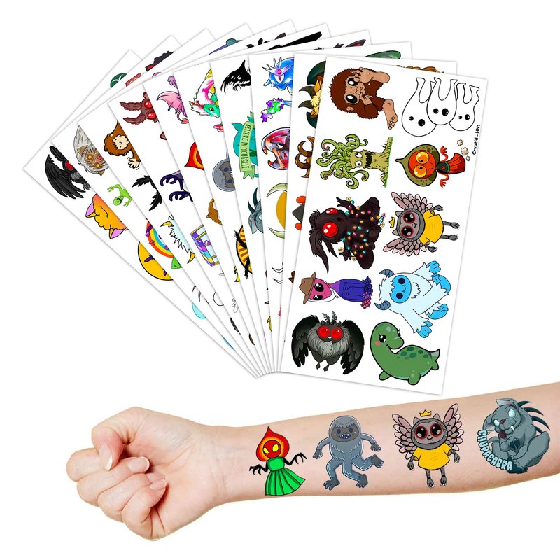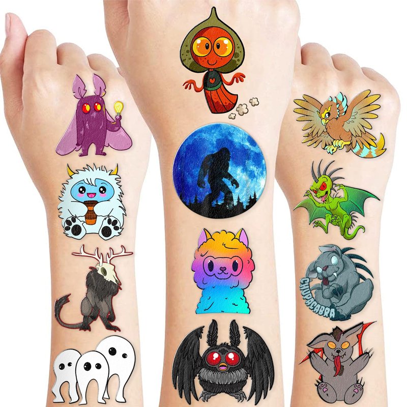 - Pattern rich: Cute Cryptid Cool Bigfoot Mothman Yeti Temporary Tattoos for Kids include 10 Sheets 100 PCS, the size of each sheet is 6.1 * 3.1 inches. Having a variety of characteristics, shapes and vibrant colors can stimulate your children's imaginations and bring a creative atmosphere to your Cryptid Party.
