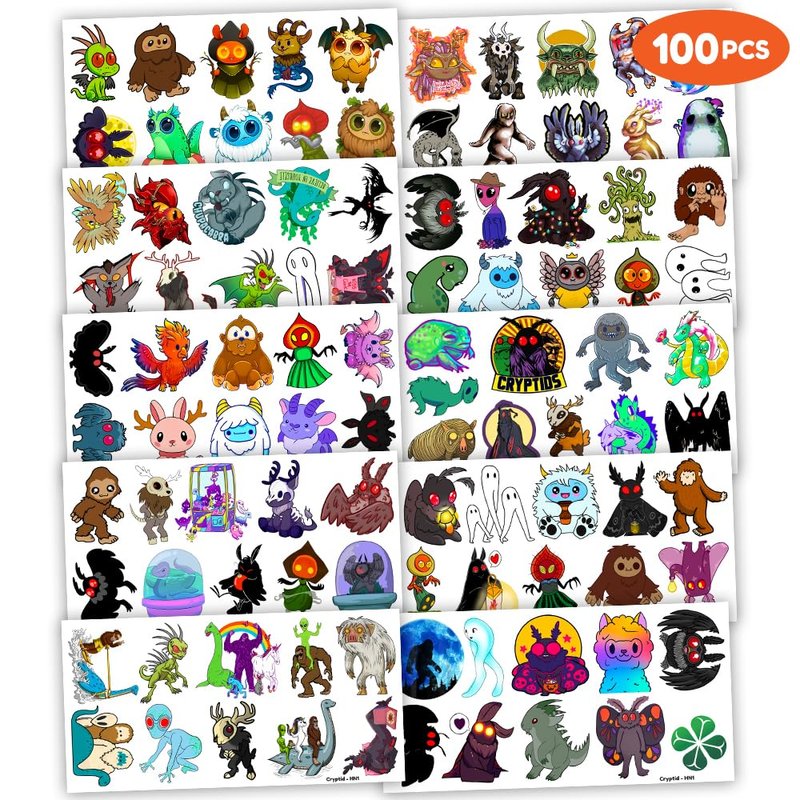 100PCS Cute Cryptid Temporary Tattoos Stickers Theme Birthday Party Decorations Supplies Favors Decor Cool Bigfoot Mothman Yeti Tattoo Gifts For Kids Adults Boys Girls School Prizes Halloween Carnival