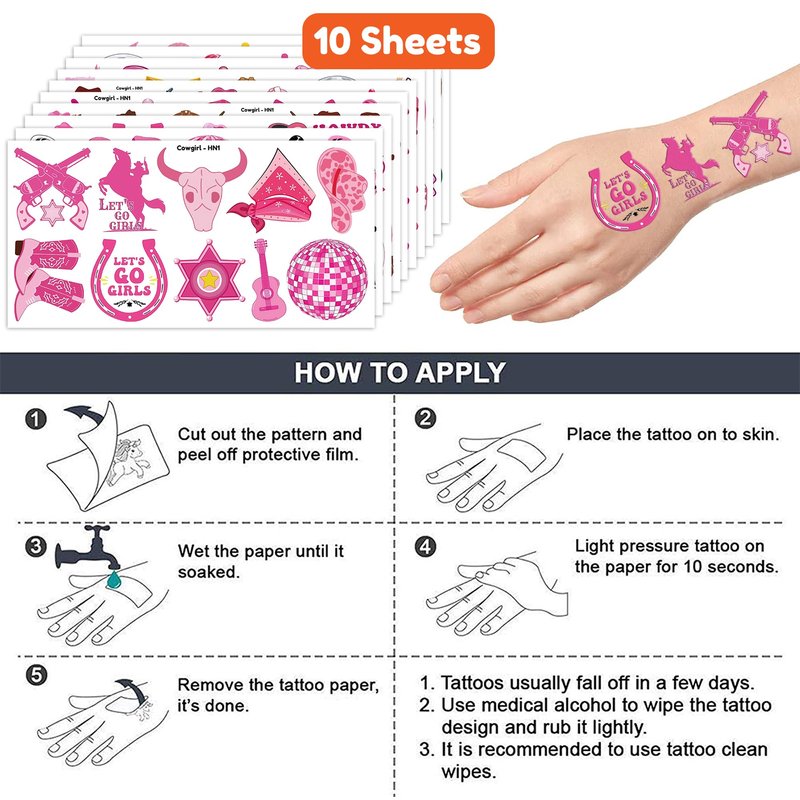 - Pattern rich: Disco Cowgirl Pink Western Horse Rodeo Preppy Y2K Temporary Tattoos for Kids include 10 Sheets 100 PCS, the size of each sheet is 6.1 * 3.1 inches. Having a variety of characteristics, shapes and vibrant colors can stimulate your children's imaginations and bring a creative atmosphere to your Cowgirl Party.