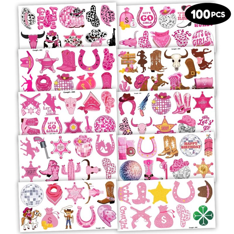 100PCS Disco Cowgirl Temporary Tattoos Stickers Themed Pink Western Horse Rodeo Birthday Party Supplies Favors Decorations Preppy Y2K Tattoo Sticker Gifts For Women Girls School Prizes Carnival