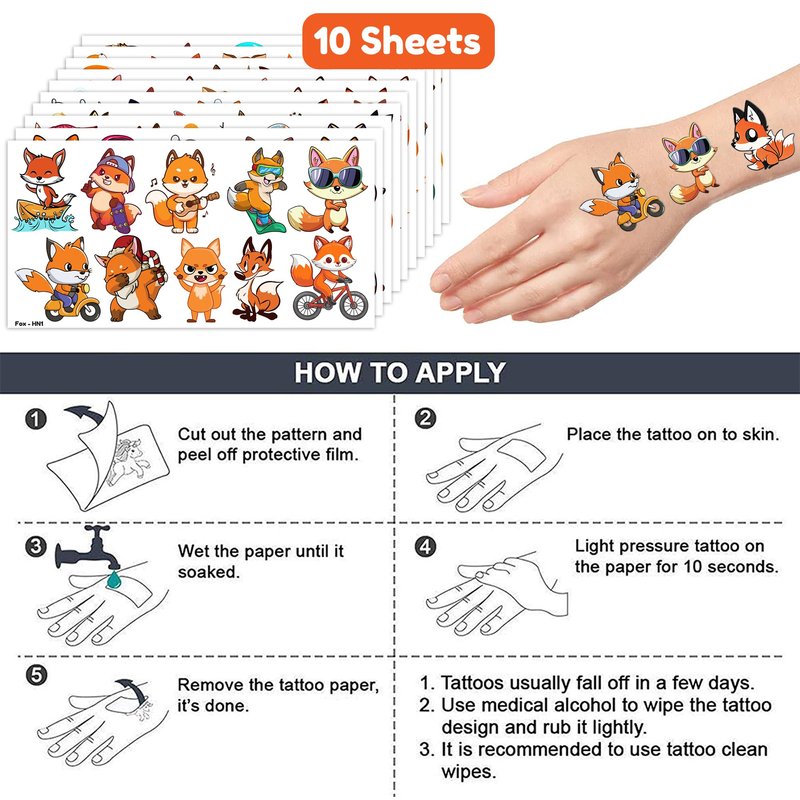 - Pattern rich: Fox Woodland Animals Cute Farm Forest Foxes Fall Temporary Tattoos include 10 Sheets 100 PCS, the size of each sheet is 6.1 * 3.1 inches. Having a variety of characteristics, shapes and vibrant colors can stimulate your children's imaginations and bring a creative atmosphere to your Fox Party.