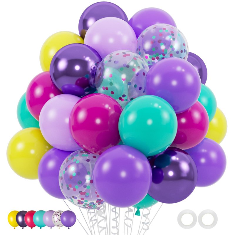 - Package Includes : You will get 100pcs 12inch pink blue purple balloons in one kit, includes 15pcs metallic purple balloons, 15pcs pastel purple balloons, 15pcs teal blue balloons, 15pcs yellow balloons, 15pcs hot pink balloons, 15pcs macaron purple balloons, 10pcs purple pink blue confetti balloons, 2pcs balloon ribbons.