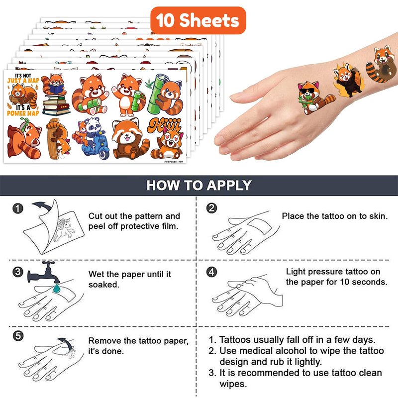 - Pattern rich: Red Panda Forest Woodland Zoo Jungle Safari Animals Temporary Tattoos for Kids include 10 Sheets 100 PCS, the size of each sheet is 6.1 * 3.1 inches. Having a variety of characteristics, shapes and vibrant colors can stimulate your children's imaginations and bring a creative atmosphere to your Red Panda Party.