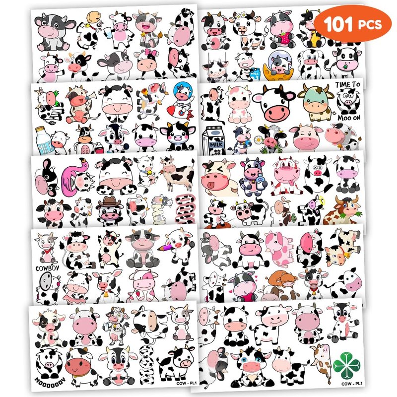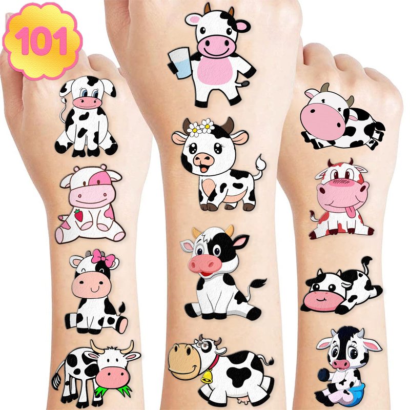 101 PCS Cow Print Farm Animals Temporary Tattoos Themed Birthday Party Decorations Favors Supplies Decor Funny Holy Cow Im One Tattoo Stickers Gifts For Boys Girls Class Prizes Carnival Cartoon
