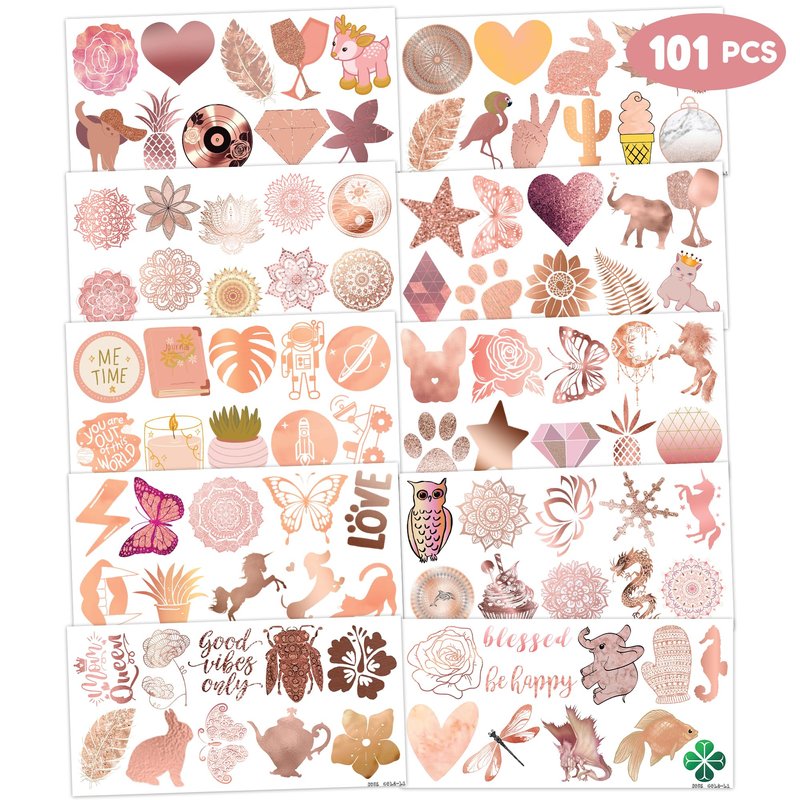 - π PERFECT TATTOOS FOR ROSE GOLD THEMED DECORATION: ROSE GOLD TATTOOS for people who love ROSE GOLD. Featuring 10 sheets with 101 pcs of lovely, fun and colorful design. Each sheet measures 6.1 * 3.1 inches. You can temporarily tattoo them on your body or objects such as phones, bottles, laptopβ¦