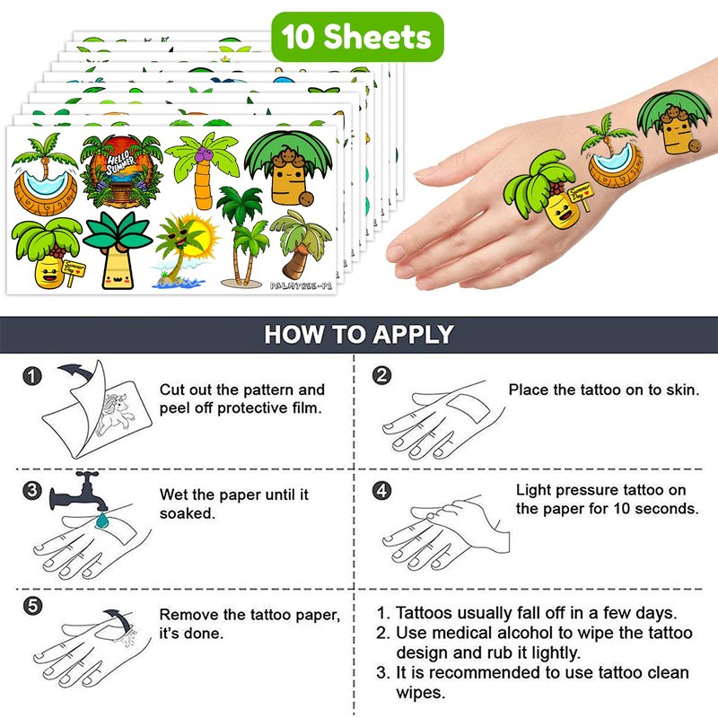 - 🌴PALM TREE DECORATIONS: Hi everyone! An amazing set of 10 sheets including 101 a size of 6.1 by 3.1 inches. These PALM TREE tattoo pieces will be sent to you quickly, place your order to get these temporary tattoos.