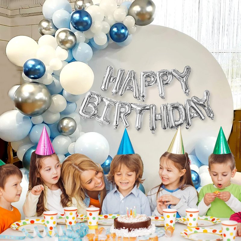 - Premium Quality Balloons---The white balloons and Blue metallic balloons are made of high quality latex, which are durable and non-toxic. Latex balloons can support air and helium. Please do not inflate the balloon more than 90%, or rub against overheated and sharp objects to avoid sudden popping. Party balloons will stand well in the whole party.