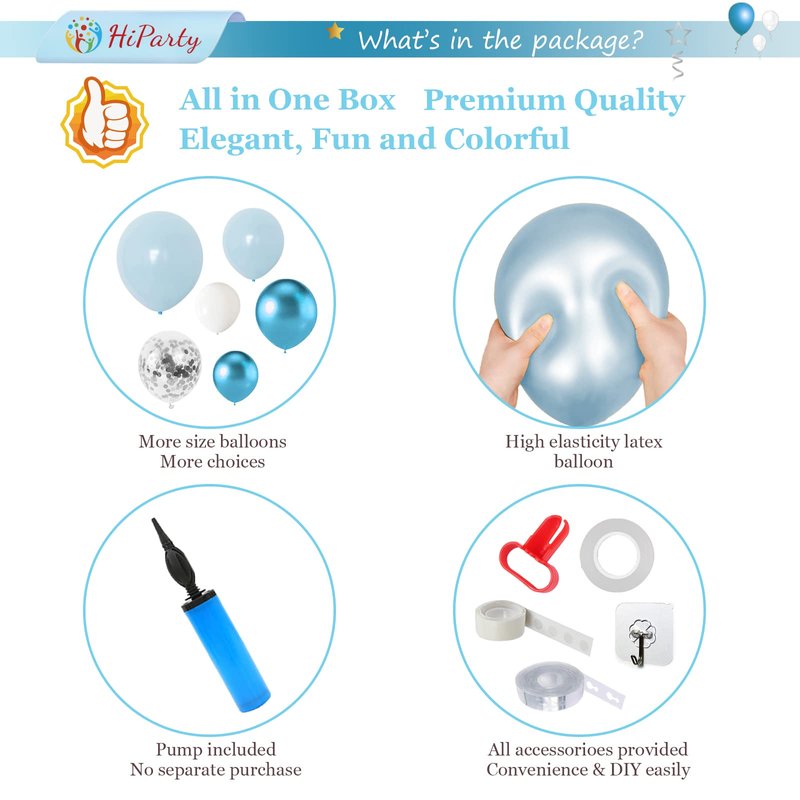 HiParty is a good brand in Party supplies field. We've worked across Design and sales in the Party decoration for many years. Every party deserves to be extraordinary, we are dedicated to make a difference in all of your celebrations. Helping others create unforgettable moments is what we live for. We’re just happy that you’re happy. What you get: --1pc 3D Foil Happy Birthday Banner--1pc 18" Blue Metallic Balloons --1pc 18" White Balloons --5pcs 12" Blue Balloons --5pcs 12" White Balloons--8pcs 12'' Silver Confetti Balloons--10pcs 10'' Blue Balloons--10pcs 10'' White Balloons--10pcs 10" Blue Metallic Balloons--3pcs 10'' Foil Balloons--10pcs 5" Blue Balloons--10pcs 5" White Balloons--5pcs 5" Blue Metallic Balloons--3pcs hook--1pc Air Pump--1pc ribbon(10M) --Glue Dot(100dots)--1pc Tie Tool--1pc Balloon Strip--Custom CardHiParty Custom Packaging Warranty&Customer service: You can feel confident using our HiParty brand balloons, we take care of all quality-related issues with a REPLACEMENT or REFUND. 24-Hour friendly customer support 30-Day no reason for refund guarantee 12-Month warranty for quality-related issues We hope you never have such need,but if you do,our friendly and hassles-free service will work hard to put a smile back on your face.