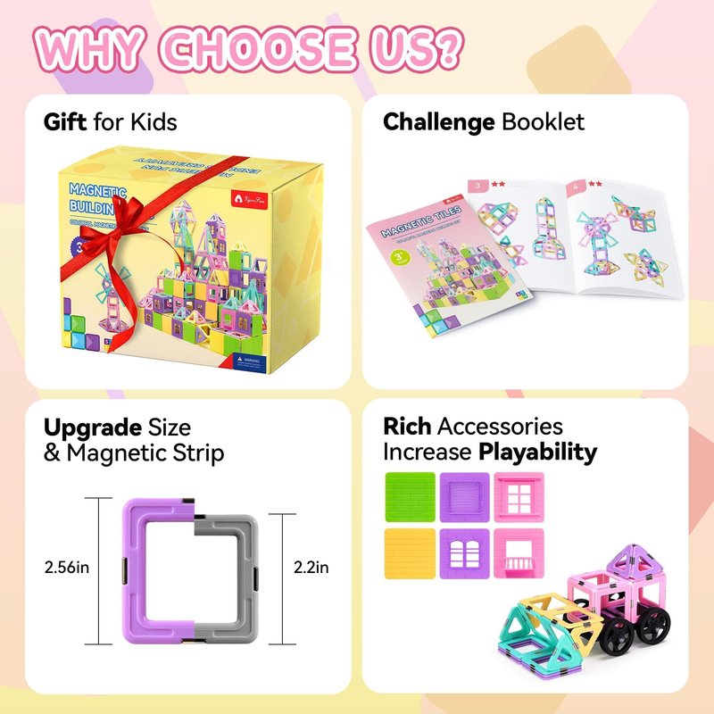 - 102 PCS Magnetic Tile Toy Set: This 102-piece magnetic toy set includes rich magnetic tiles, 2 toy cars, and a challenge booklet. The richly shaped magnetic tiles and diverse accessories enrich the traditional playstyles of magnetic tiles, bringing more creativity and fun to challenges, and fostering continuous learning and growth through entertainment