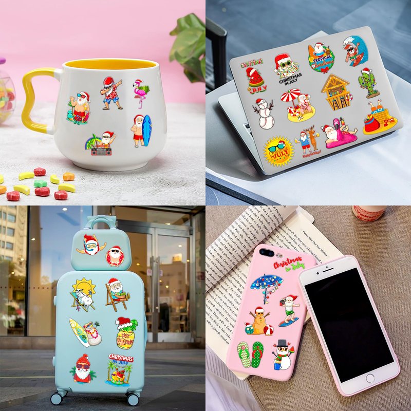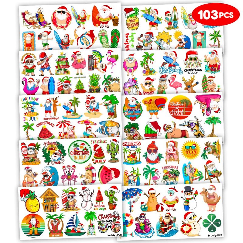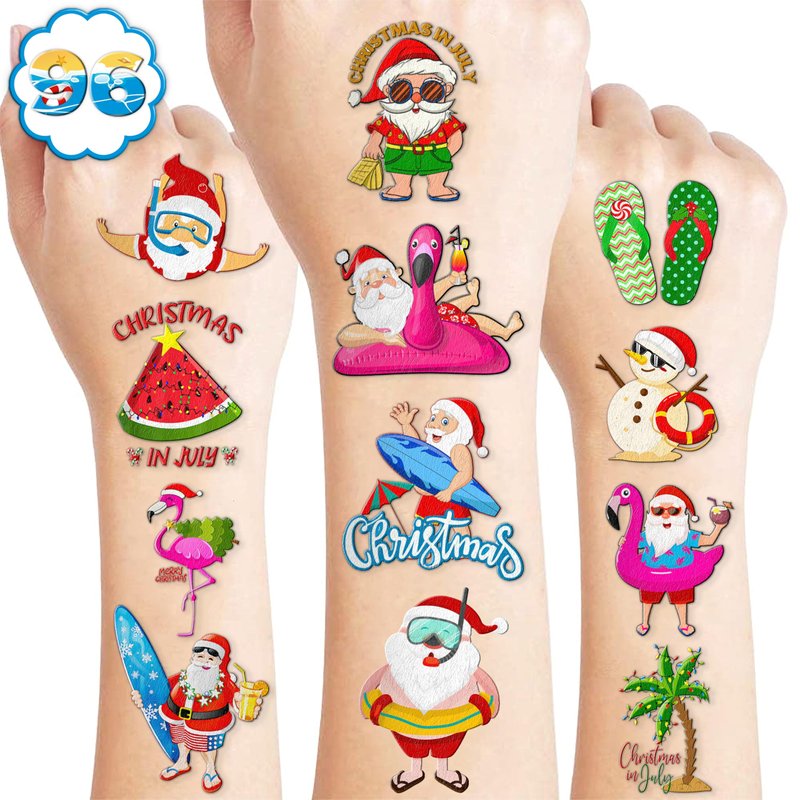 - Cute Christmas Tropical Luau Birthday Party Supplies: 10 sheets Christmas Beach Hawaii Hawaiian Santa Xmas theme temporary tattoos stickers, features an assortment of cute themed characters, each sheet measures 6.1 x 3.1 inch , all kinds of designs and colors will bring more fun to your party, one size fit all adult and kids.
