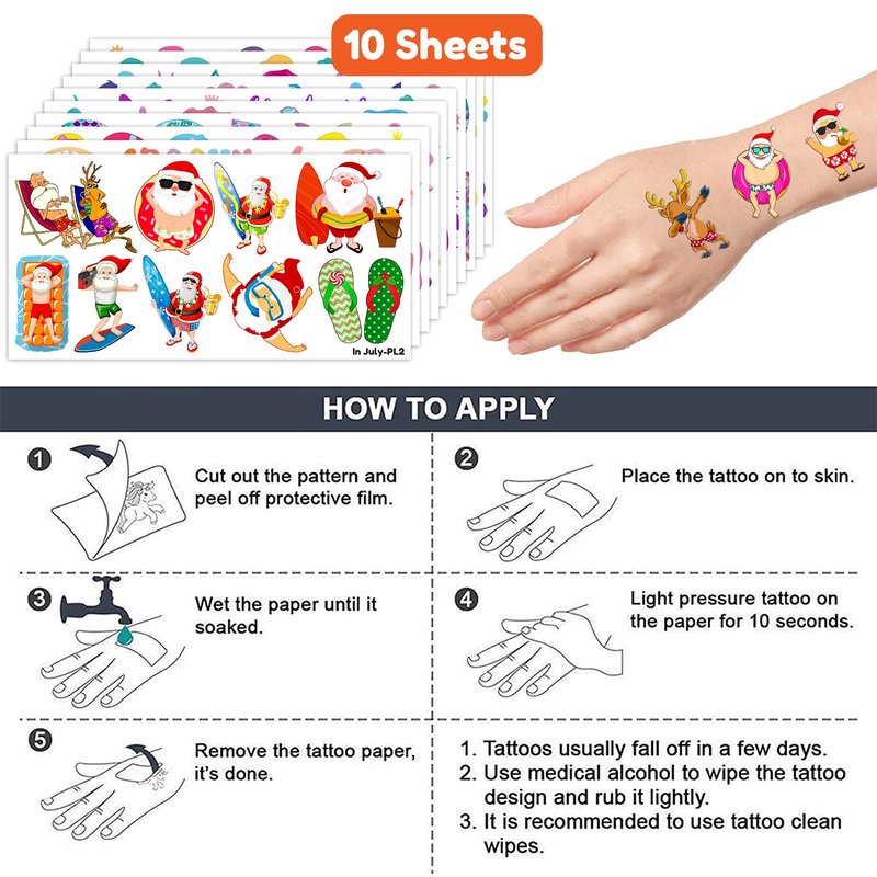 Cute Christmas Tropical Luau Birthday Party Supplies: 10 sheets Christmas Beach Hawaii Hawaiian Santa Xmas theme temporary tattoos stickers, features an assortment of cute themed characters, each sheet measures 6.1 x 3.1 inch , all kinds of designs and colors will bring more fun to your party, one size fit all adult and kids. Perfect Christmas Tropical Luau Birthday Decorations: All the temporary tattoos are design with many themed. Fits any smooth part: face, hands, arms, shoulders, back, legs water bottle, cup,mug and other stuff and so on. Great fun for party favors, birthday gift, clubs, festivals or party supplies,etc. and can be used by children, kids, girls, boys, women, men. Easy to Use and Remove: Cut out the desired motif, rub the back of the tattoo with a damp cloth or sponge for 30 seconds. They have been put through rigorous party testing and are 100% guaranteed to last all day. Simply soak the tattoo with baby oil or olive oil alcohol and remove the tattoo after a few minutes. Safe And High Quality: High quality printing makes all dessert patterns colorful and realistic, waterproof. Importantly, which is harmless to kids, non-allergenic for kids skin. Should not be used for children under 3 years old, people with a history of sensitive skin, and if any symptoms appear, stop using immediately. We all recommend using a small part to use the test first, and if there is no problem, it can be used normally. Customer Service: We guarantee to provide you with a good shopping experience. If you have any questions, please contact us. We will try our best to help you solve the problem and ensure that you have the best shopping experience.