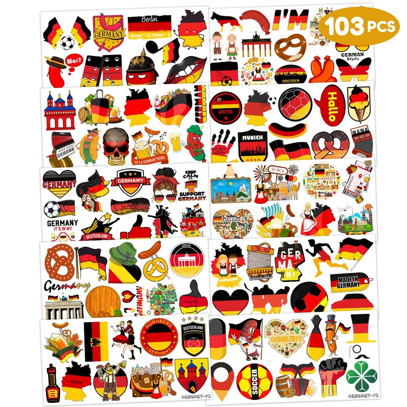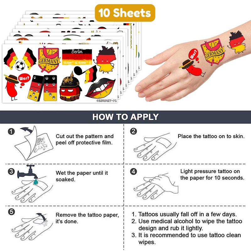 - 🥨GERMANY PARTY DECORATIONS: Hi everyone! An amazing set of 10 sheets including 103 a size of 6.1 by 3.1 inches. These GERMANY tattoo pieces will be sent to you quickly, place your order to get these temporary tattoos.