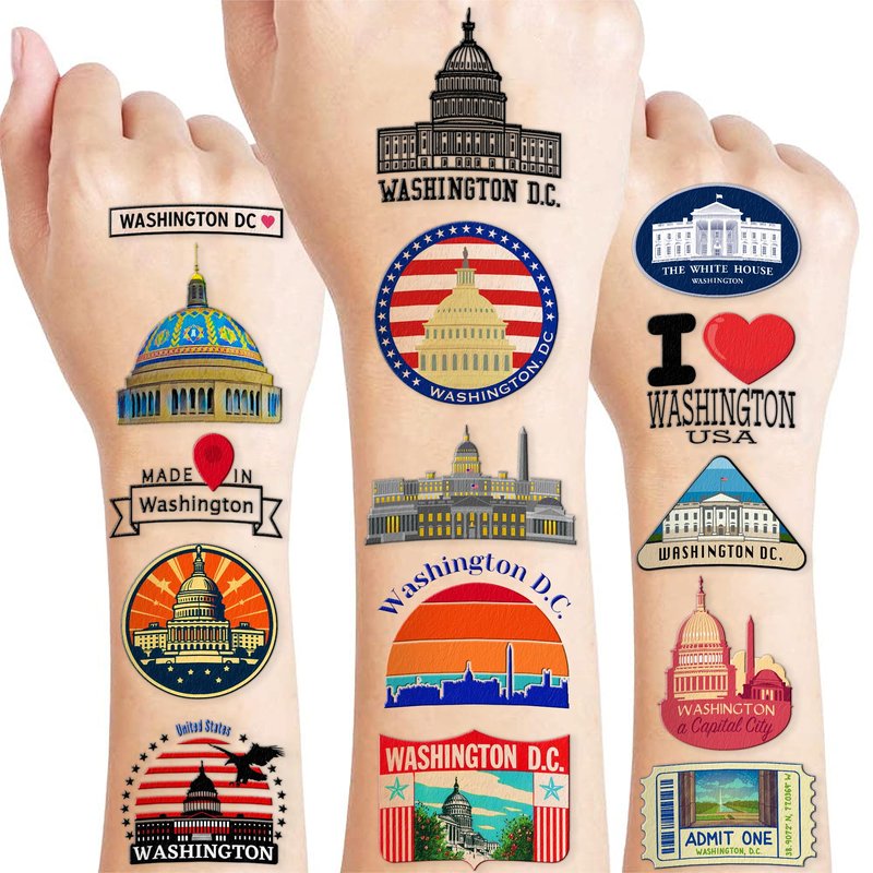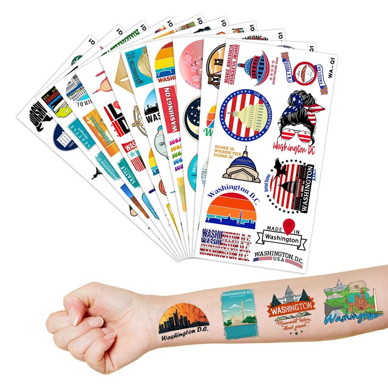 - Cute And Funny Love Washington USA Capital City Skyline State Travel Themed Tattoos: Cute Washington Temporary tattoos Stickers, features an assortment of themed characters, colors are bright, and designs are adorable, use them as party favors and your kids will love. Perfect for themed party, birthday activities, school reward and other party events. They will be your kids' favorite small gifts.