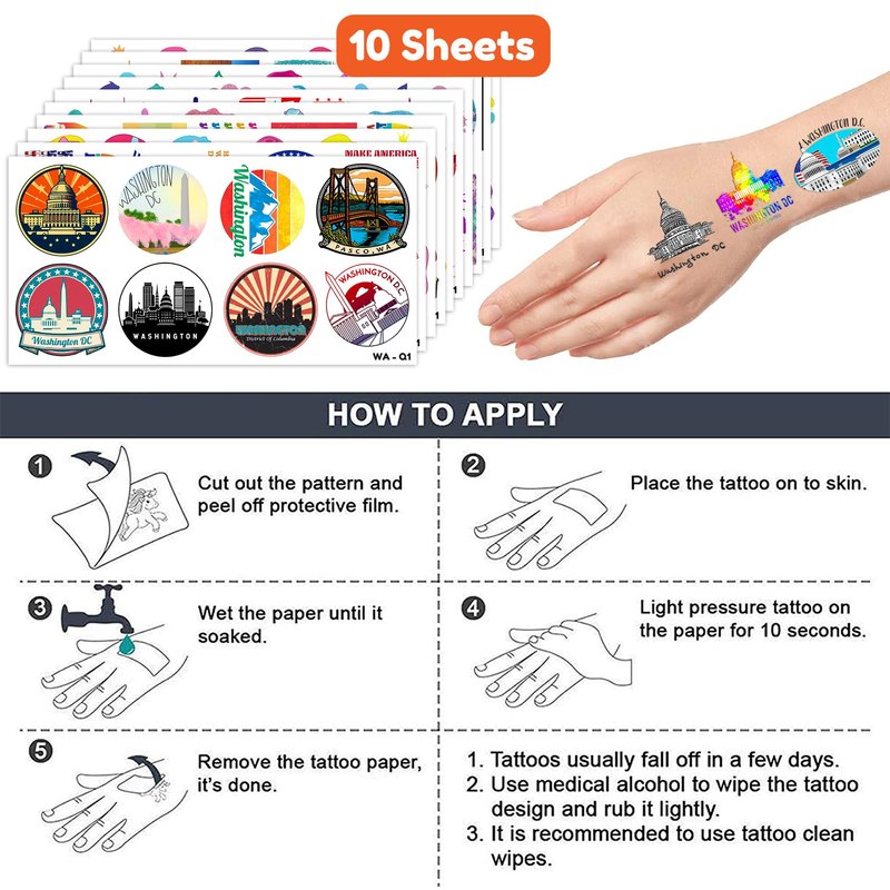 Love Washington USA Capital City Skyline Birthday Party Supplies: 10 Sheets Washington USA State Travel railway crossing stop temporary tattoos stickers, Have a variety of cartoon themed characters, Children can easily Washington USA State Travel railway crossing stopstickers and take unique photos to make fond memories. The size of each sheet is 6.1 * 3.1 inches. Love Washington USA Capital City Skyline Birthday Party Decoration: The set contains instructions for use and is easy to use. Train railway crossing stop tattoo stickers can be applied on arms, face, hands, neck, shoulders, legs, wrists and ankles to make you look cool at all kinds of parties. Popular hit with your kids. You can apply them to your body or some smooth objects, for example, glass, stationery, paper, crafts cups, cabinet, bottle. Cute And Funny Love Washington USA Capital City Skyline State Travel Themed Tattoos: Cute Washington Temporary tattoos Stickers, features an assortment of themed characters, colors are bright, and designs are adorable, use them as party favors and your kids will love. Perfect for themed party, birthday activities, school reward and other party events. They will be your kids' favorite small gifts. More Safety & Healthy Choice: These temporary tattoos are made of high quality safety and green paper, Non-allergenic and totally safe for your kid's skin. Simply wet the tattoo with water and stick transferred them onto your body, hands, faces and arm you like. Tattoos will last from 3 to 5 days ,it also can be easily removed with baby oil, makeup remover or rubbing alcohol. Not recommended for people with a history of sensitive skin, if symptoms appear, stop using immediately. How to Use: Cut out tattoo of choice and remove clear sheet. Place tattoo face down on skin. Wet the tattoo thoroughly with a sponge. After 20-30 seconds, gently remove the backing paper. Allow the tattoo to dry. Very easy to use.