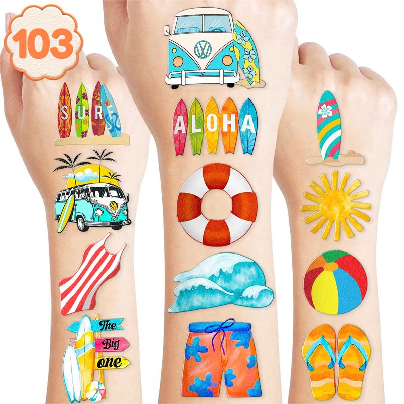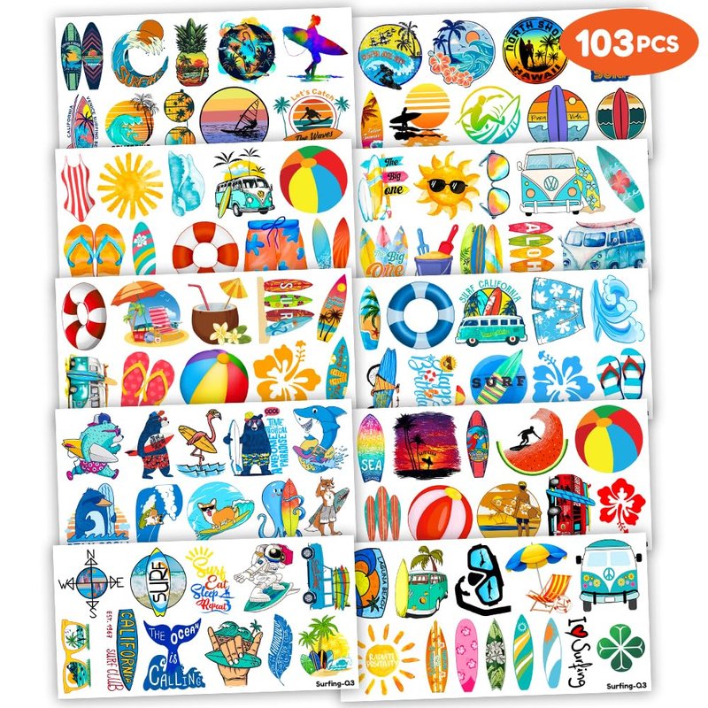 103PCS Summer Surfing Surf Temporary Tattoos Birthday Theme Party Decorations Favors Supplies Decor Cute Beach California Hawaiian Ocean Surfer Stickers Gifts for Kids Boys Girls Carnival Class Prizes