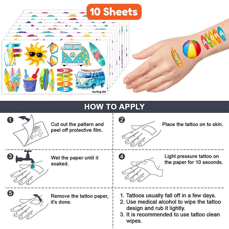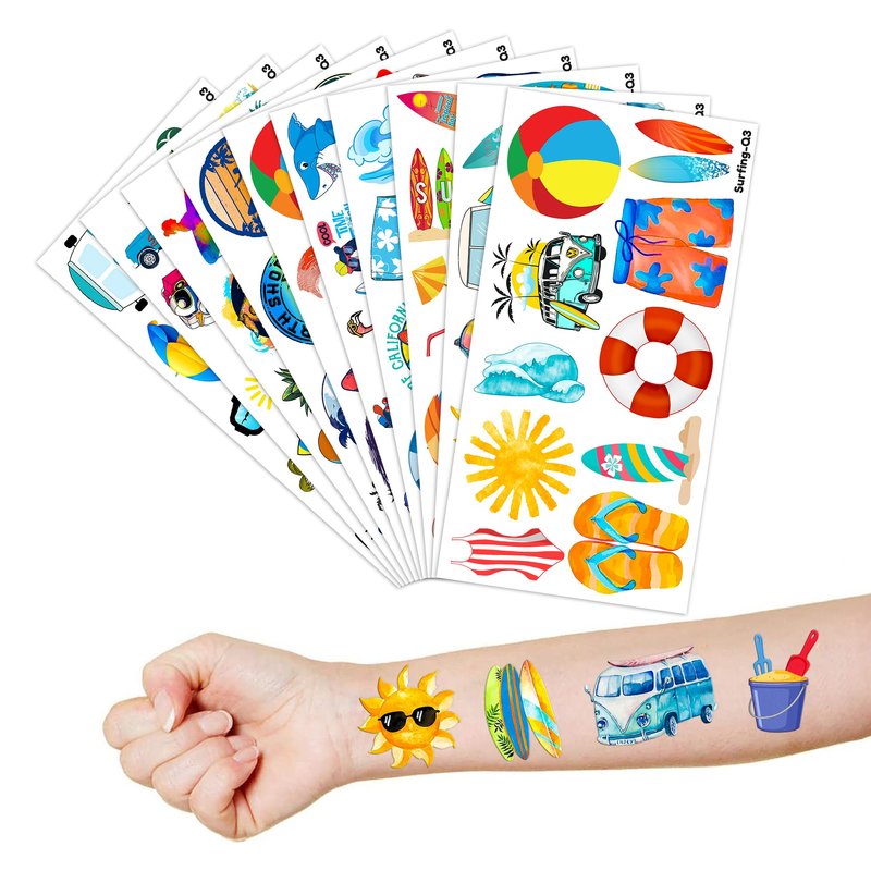 - The Perfect Summer Surfing Surf Theme Party Gift: 10 Sheets Beach California Hawaiian Ocean Surfer Surfboard Tropical tattoos stickers, each sheet measures 6.1 * 3.1 inch , one size fit all adult and kids. One of the most popular party themes for children, make the best party gifts for your children & Carnival gifts, help your children become small heroes at the party! Bring nonstop joy to the whole party! Make your kids receive full of expectation and exploration in every festival.