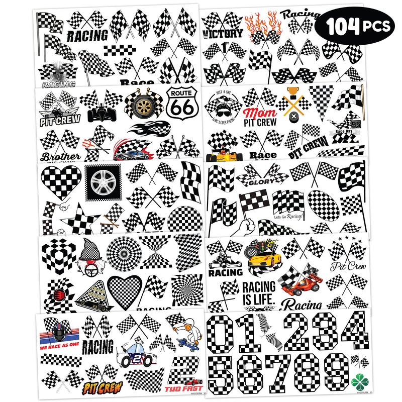 104 PCS Funny Race Car Checkered Flag Black and White Temporary Tattoos Sticker Birthday Party Decorations Supplies Favors Gifts Boys Girls Men Women Cute Racing Fake Tattoo School Prizes Carnival