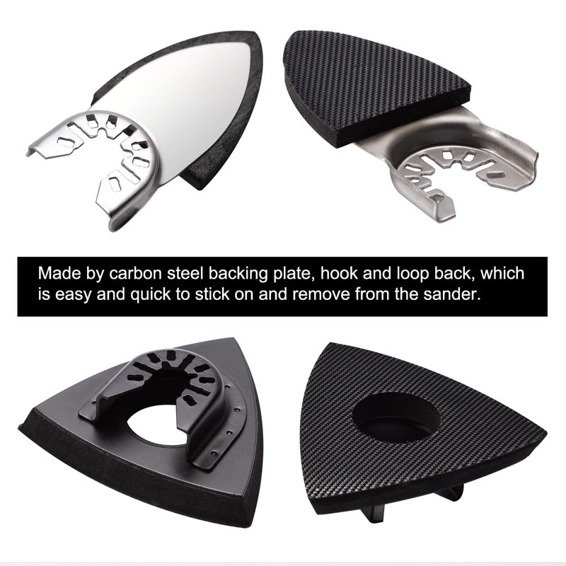 - Package Includes: Oscillating tool sanding attachments includes 2pc 80mm triangle sanding pad holder, 2pc finger sanding pad holder, 50pc-80mm sanding pad, 50 pc finger sanding pad. Assorted 60 80 100 120 240 grits oscillating tool sandpaper , 10 pcs each.