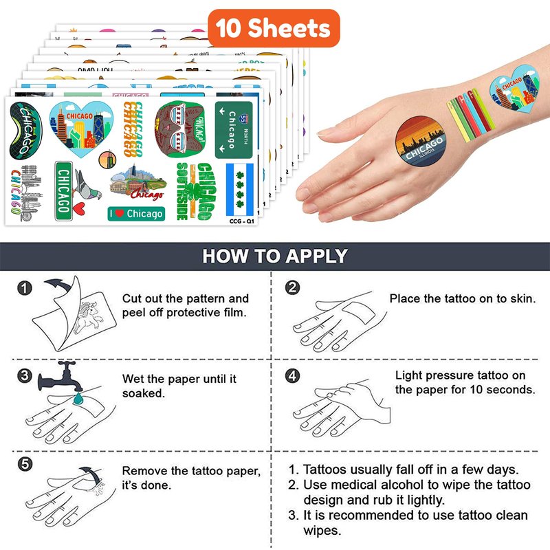 - Chicago City Skyline Flag Party Decoration: The set contains instructions for use and is easy to use. Chicago City Skyline Flag Illinois tattoo stickers can be applied on arms, face, hands, neck, shoulders, legs, wrists and ankles to make you look cool at all kinds of parties. Popular hit with your kids. You can apply them to your body or some smooth objects, for example, glass, stationery, paper, crafts cups, cabinet, bottle.