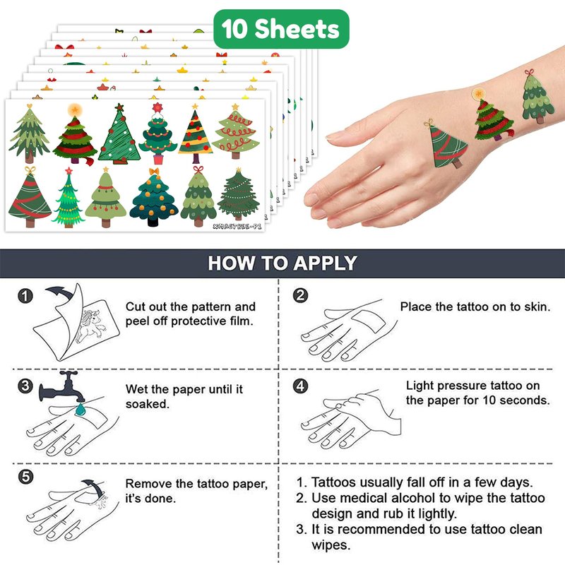 - 🎄CHRISTMAS DECORATIONS: Hi everyone! An amazing set of 10 sheets including 105 a size of 6.1 by 3.1 inches. These CHRISTMAS TREE tattoo pieces will be sent to you quickly, place your order to get these temporary tattoos.