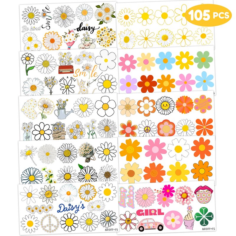 - 🌼DAISY BIRTHDAY PARTY DECORATIONS: Hi everyone! An amazing set of 10 sheets including 105 a size of 6.1 by 3.1 inches. These DAISY flower tattoo pieces will be sent to you quickly, place your order to get these temporary tattoos.